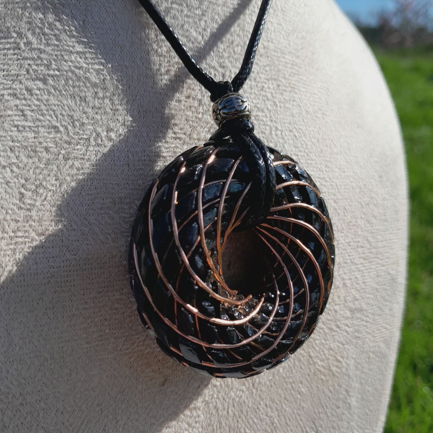 Colgante Bobina Torus de Rodin con chips de shungita. Su tamaño es de 50mm de diámetro con 2 espirales toroidales de cobre de 0,8mm. Contiene 12 vueltas x 2 direcciones a 45º con forma de toroide en la secuencia 3-6-9 de Tesla.🌌