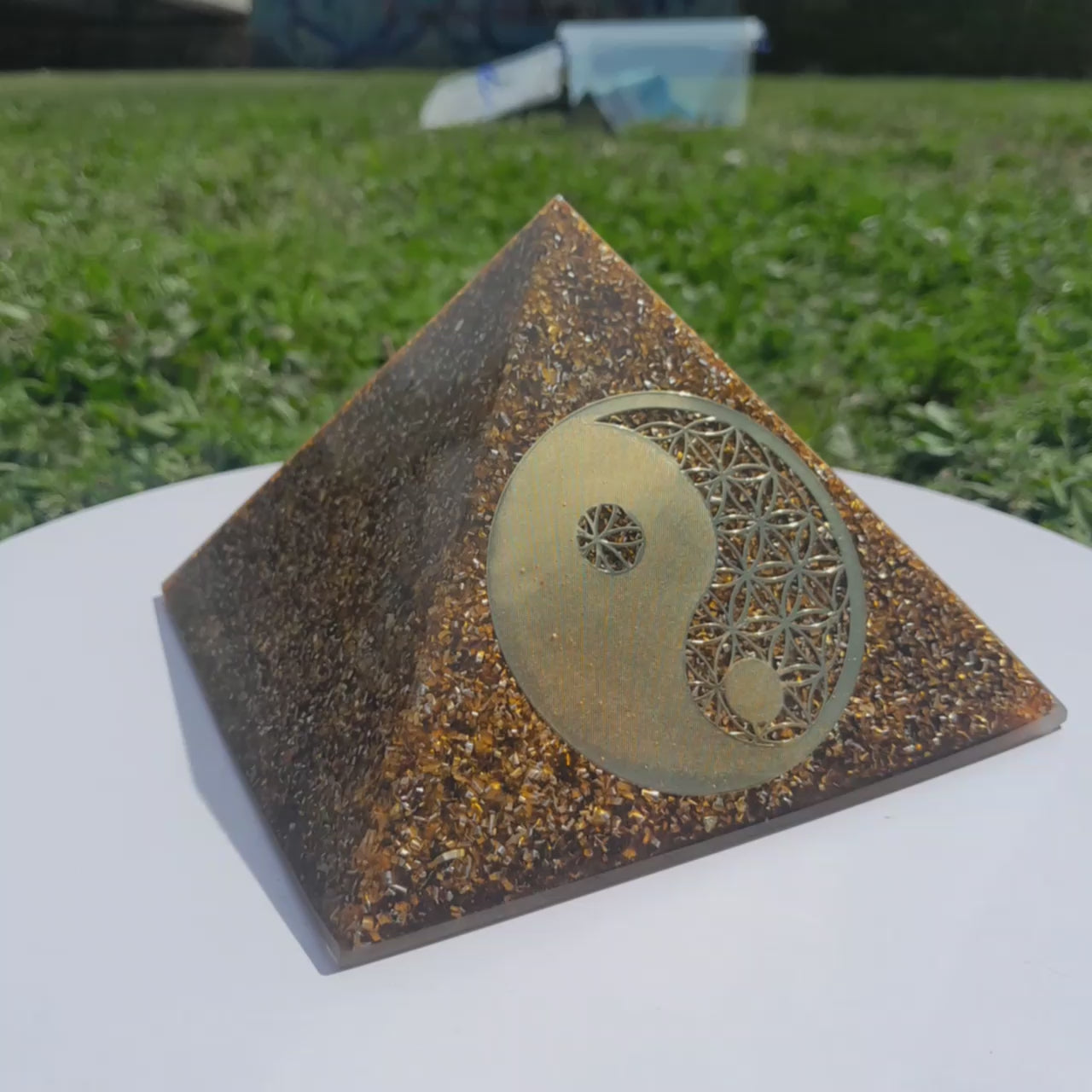 Esta Pirámide Orgonita Yin Yang con pigmentos naturales color marrón esta creada con cuarzo blanco en su interior, virutas de aluminio, resina de poliéster y pigmentos naturales.