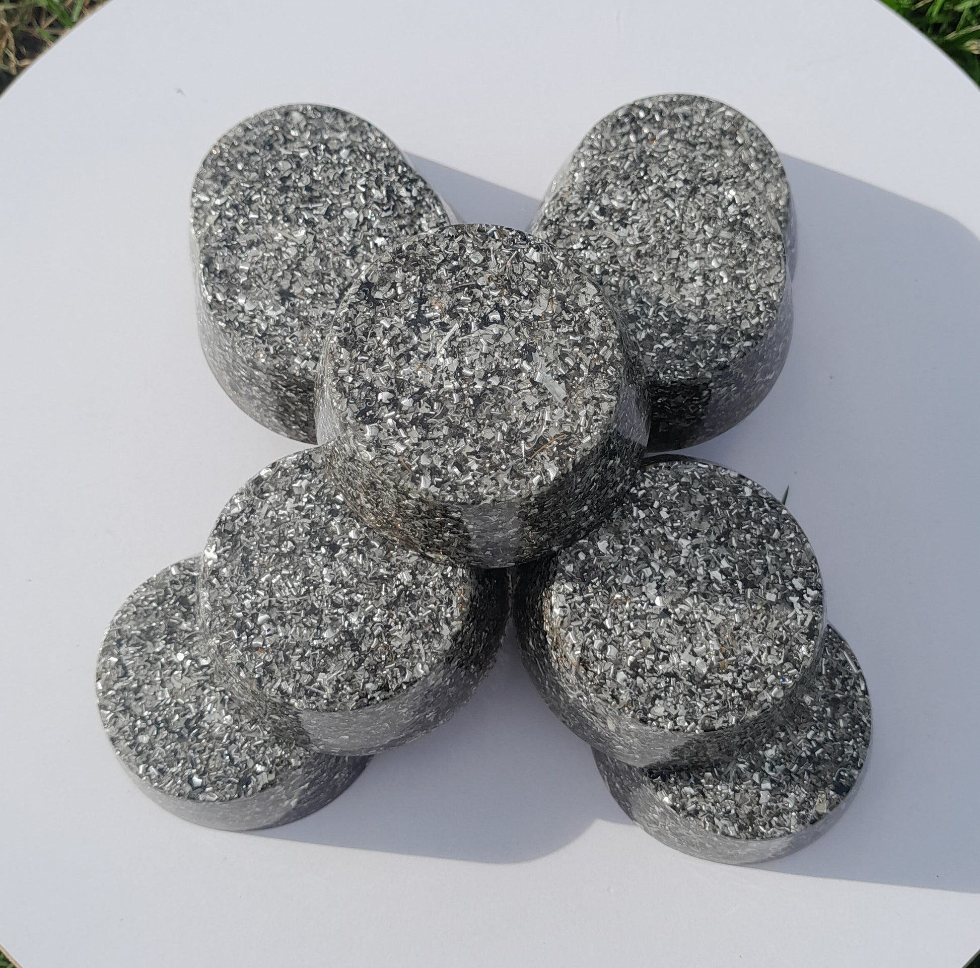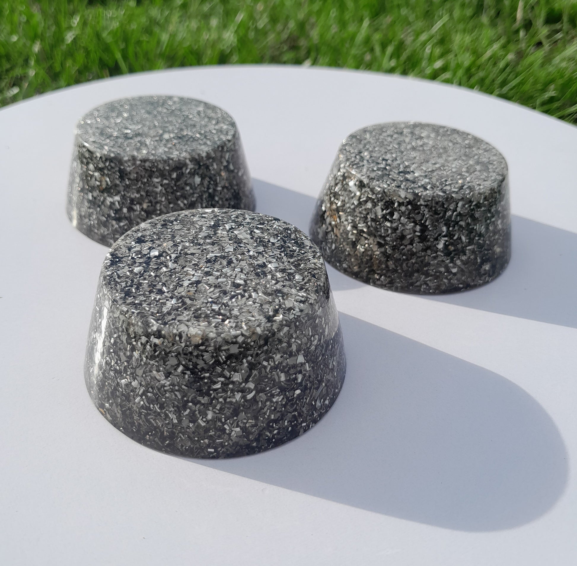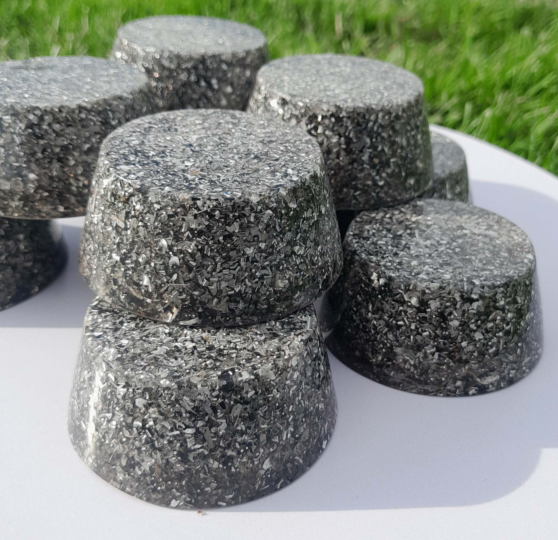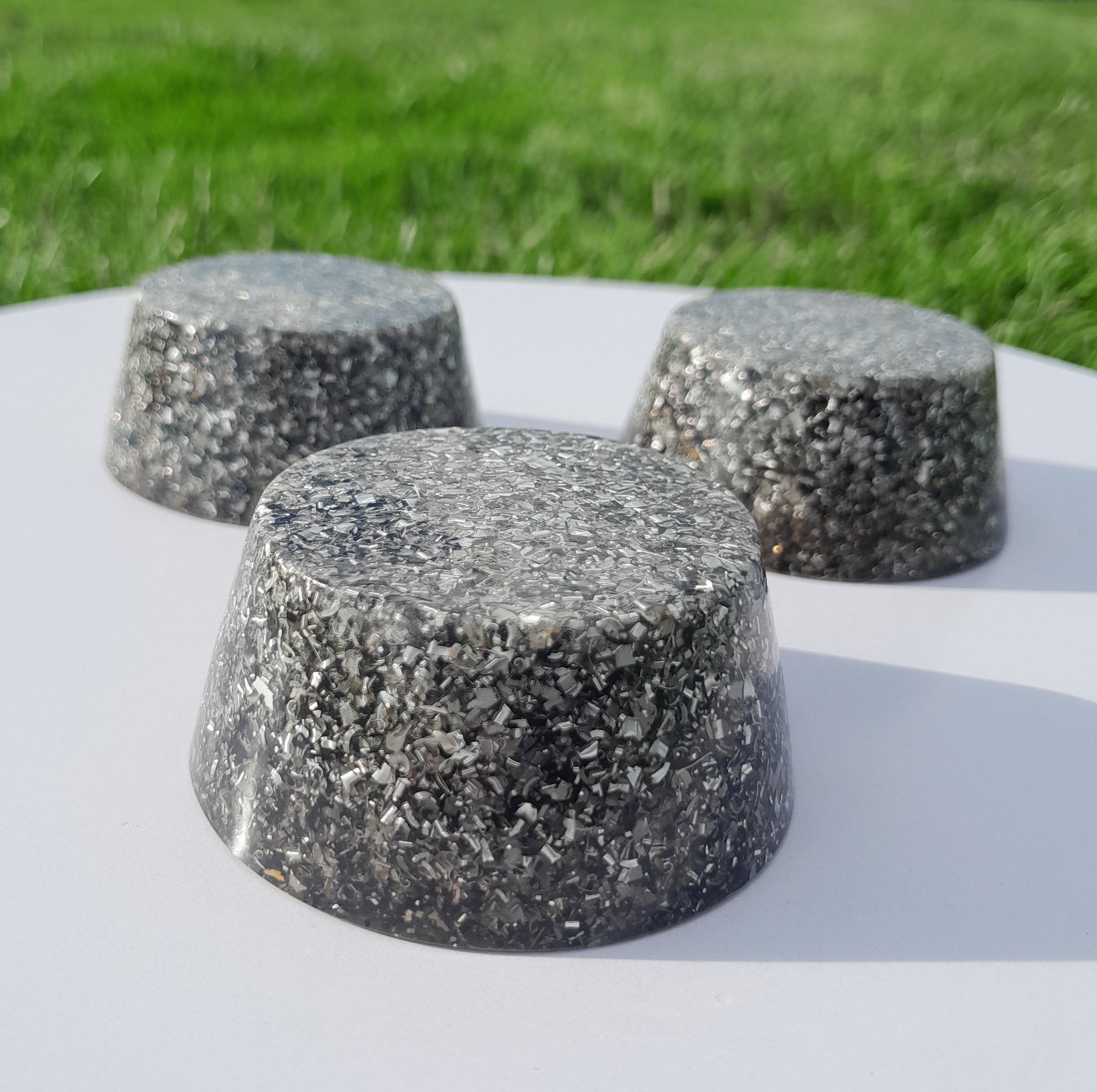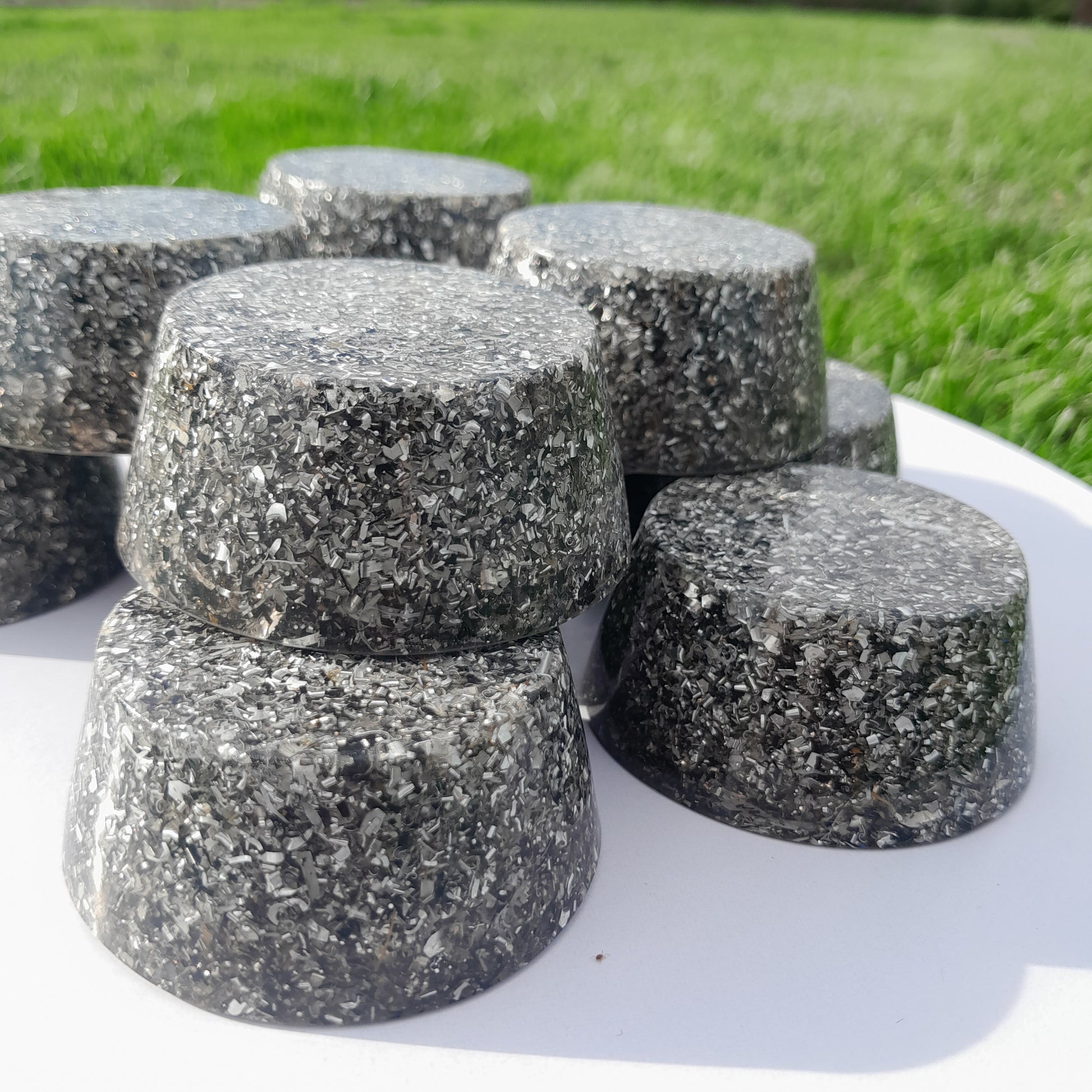 Fabricadas con resina de poliéster, virutas de aluminio y cristales de cuarzo, estas orgonitas son el equilibrio perfecto entre estética y funcionalidad. La incorporación de pigmentos naturales en diversas tonalidades les otorga un toque único, mientras que su estructura asegura un rendimiento óptimo.