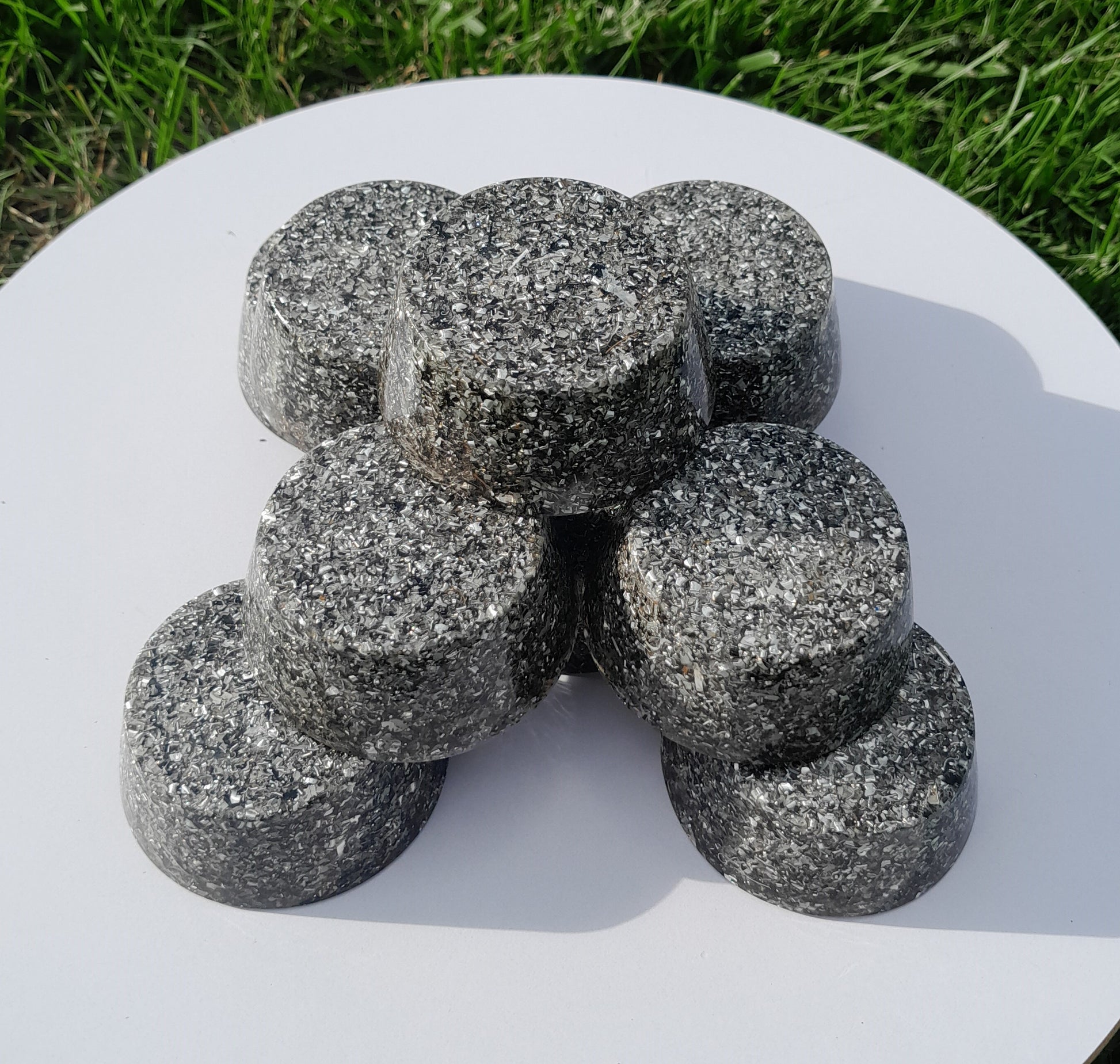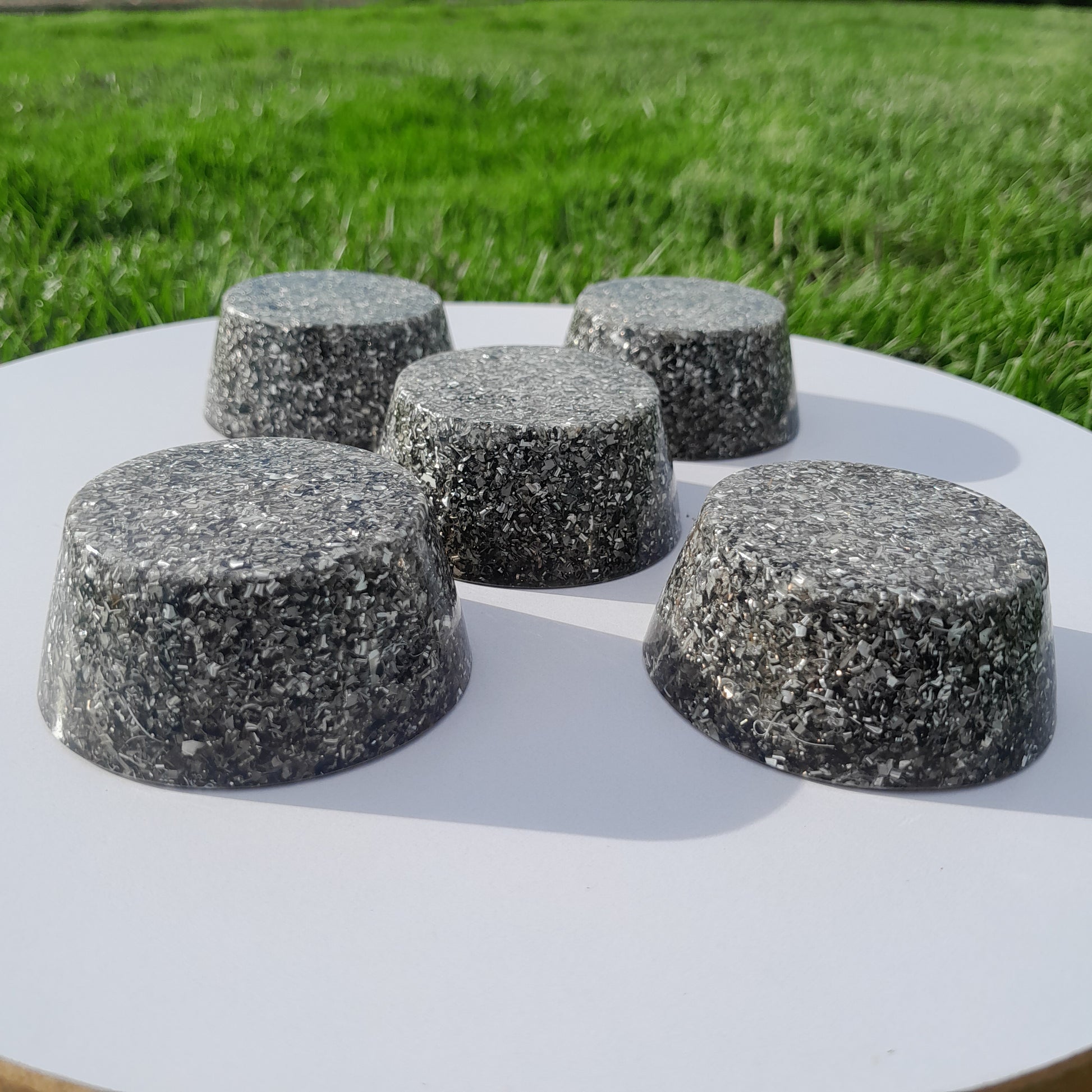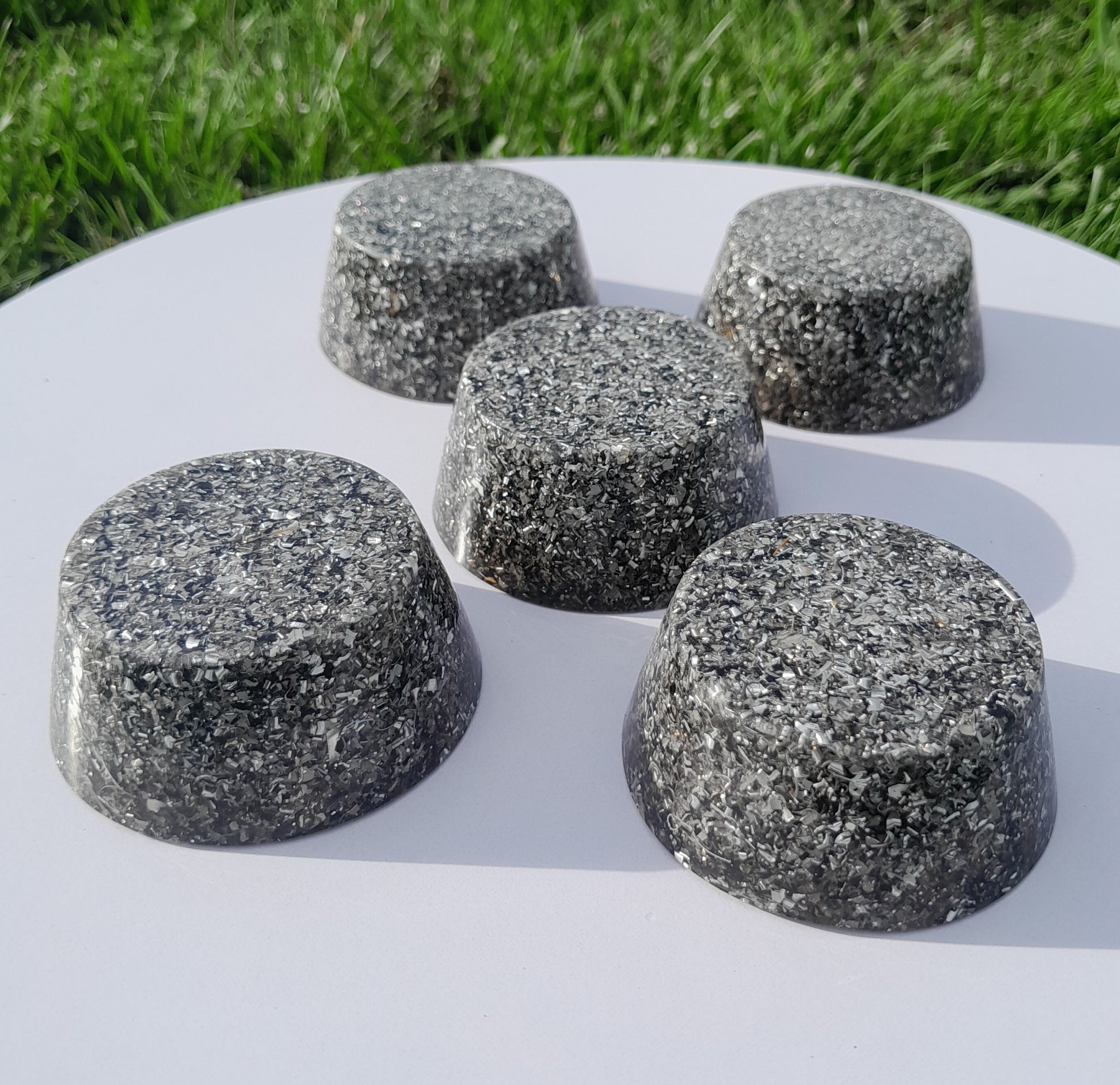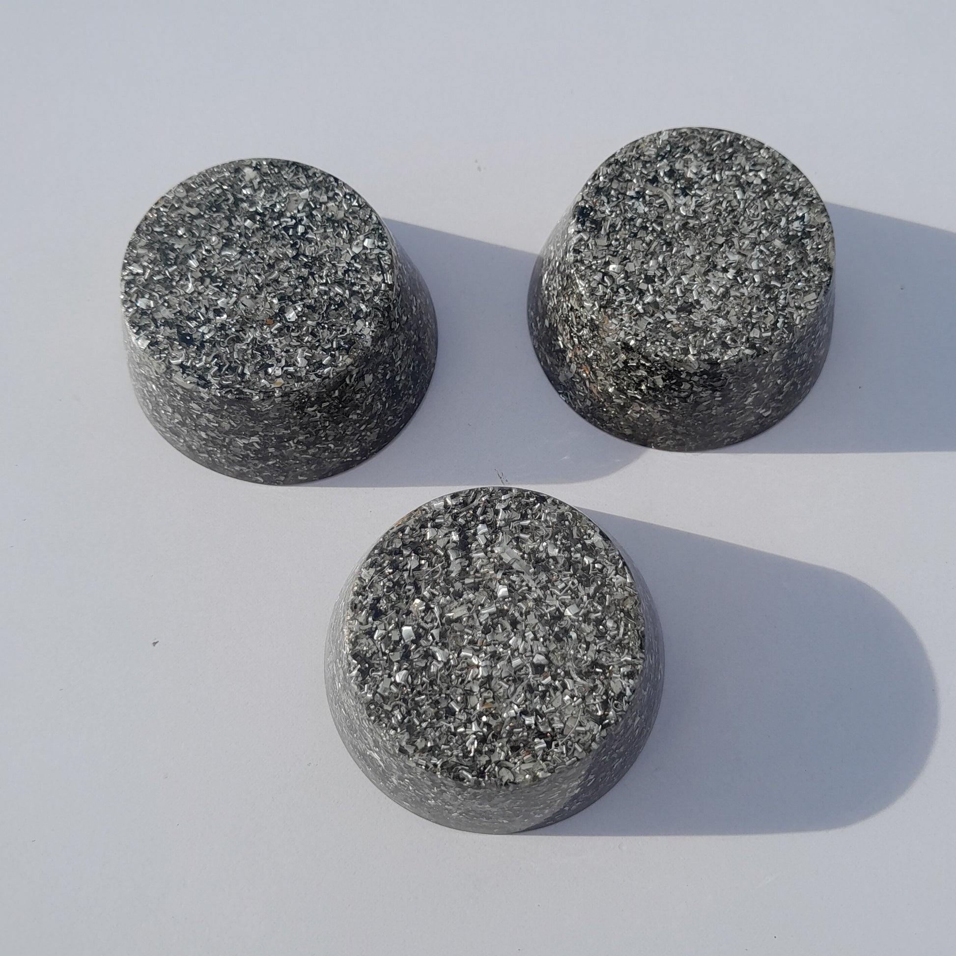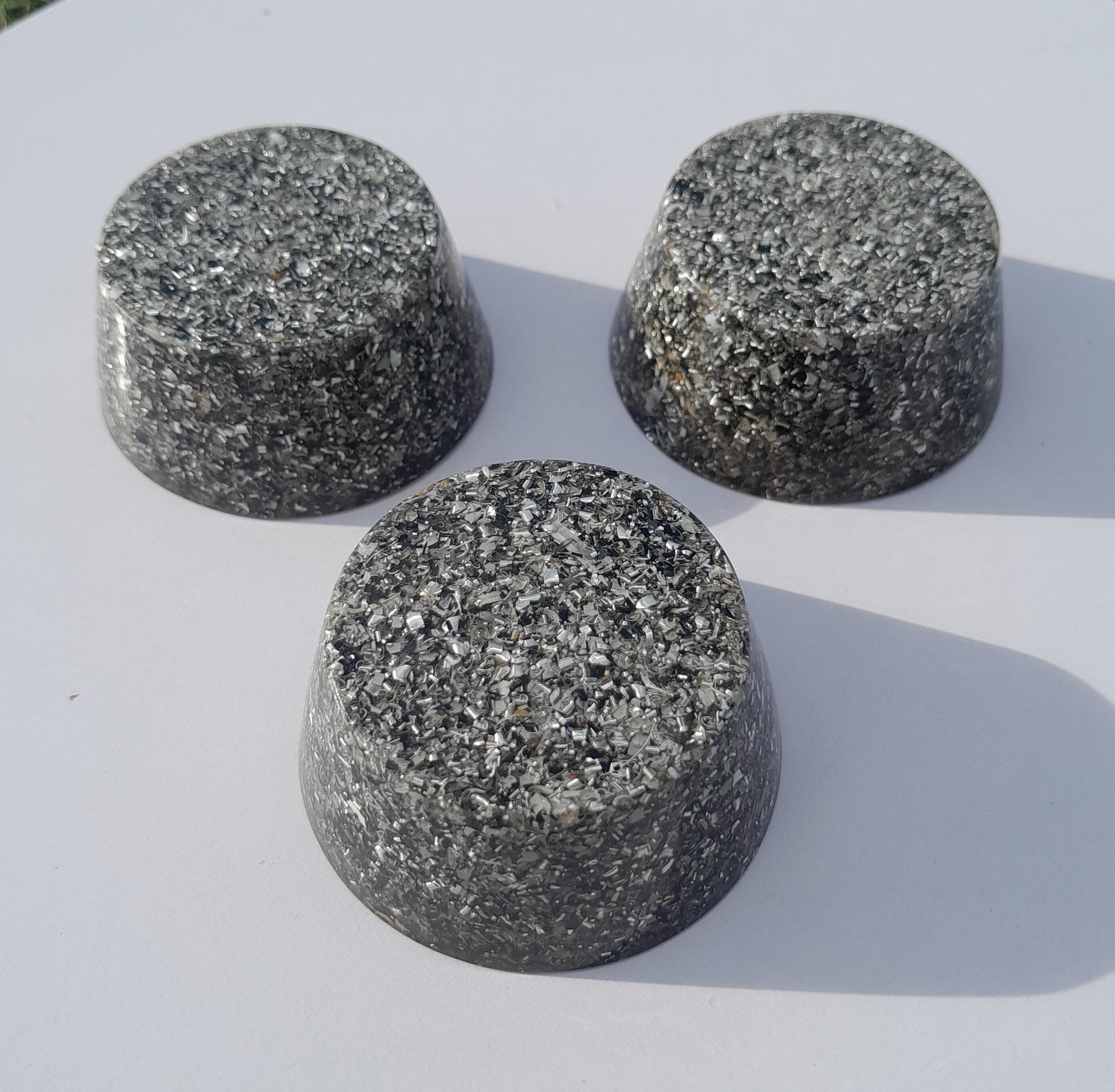Fabricadas con resina de poliéster, virutas de aluminio y cristales de cuarzo, estas orgonitas son el equilibrio perfecto entre estética y funcionalidad. La incorporación de pigmentos naturales en diversas tonalidades les otorga un toque único, mientras que su estructura asegura un rendimiento óptimo.