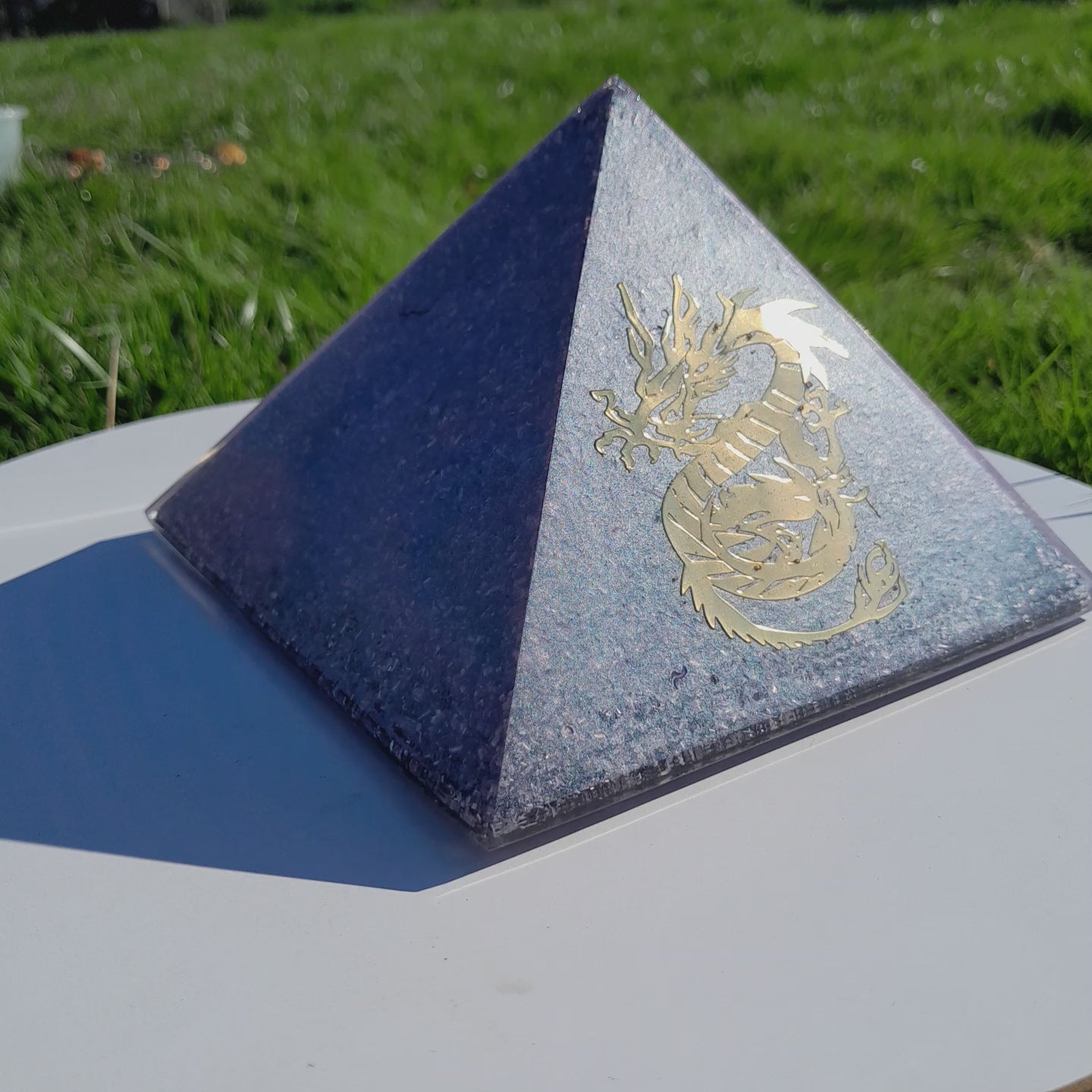 Esta hermosa pirámide orgonita violeta con un dragon de poder dorado es una pieza única hecha a mano, creada con mucha intención para llenar tu espacio de armonía y buena energía🐉